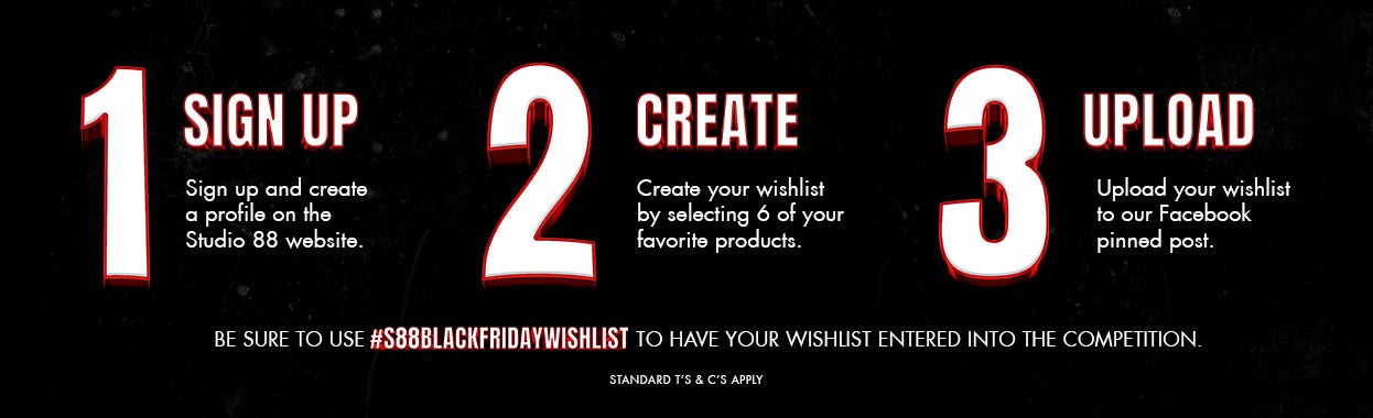 - Screenshot your Wish List and post it as a comment on our Studio 88 Wish List Facebook pinned post using the hashtag #S88BlackFridayWishList.