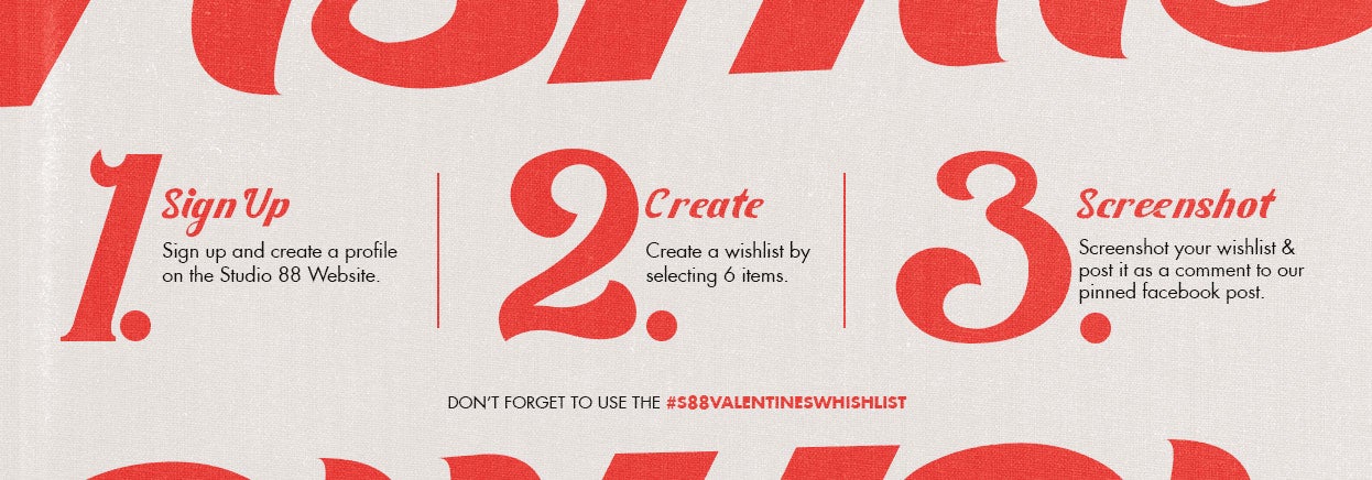 - Screenshot your Wish List and post it as a comment on our Studio 88 Wish List Facebook pinned post using the hashtag #S88ValentinesDayWishList.